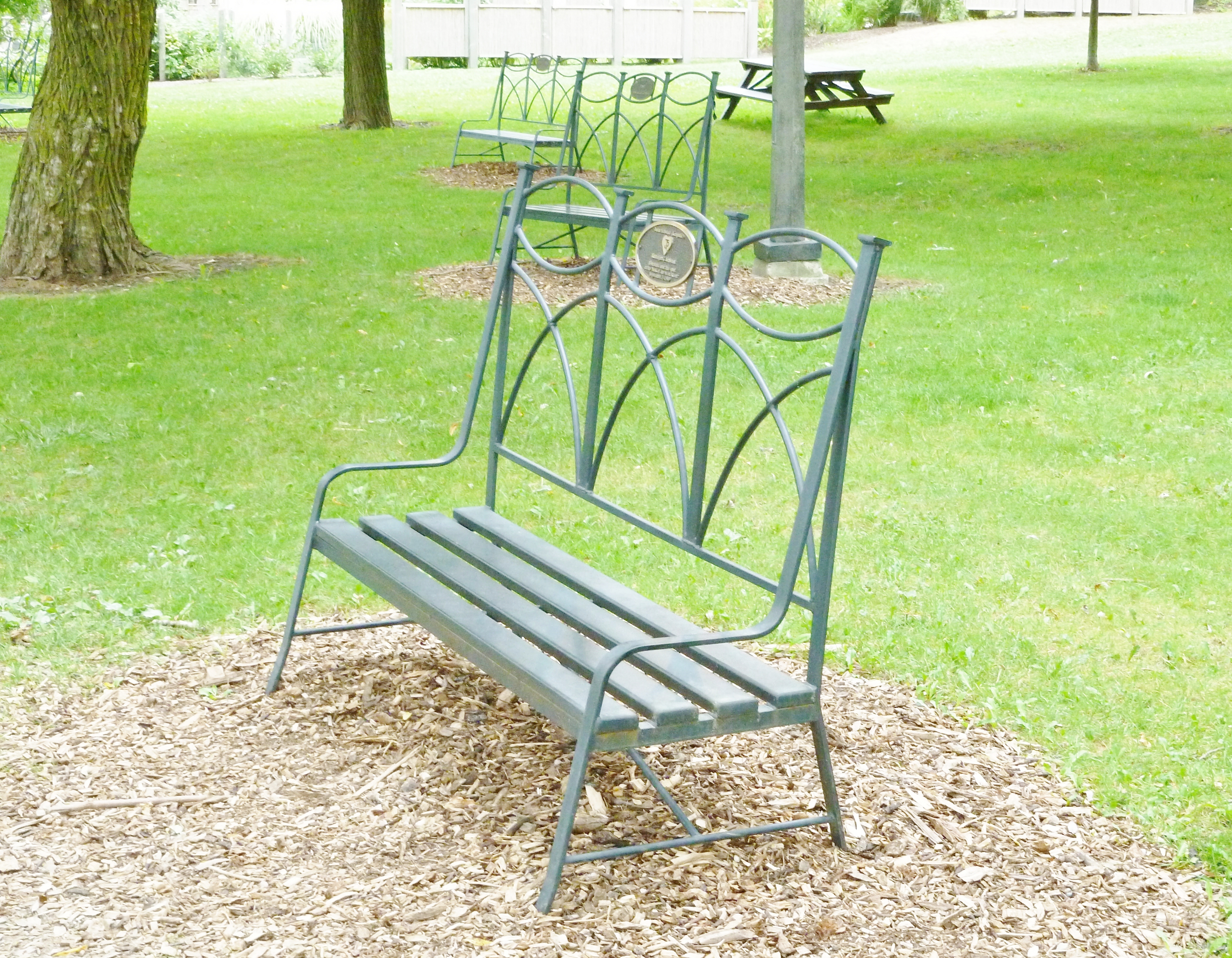 In Stratford, Ontario, there are a number along the Avon River walk. Most of them contain oval markers in memory or in honor of loved ones of the sponsors of the benches. They are lovely tributes, and provide pleasant seats to view the boats and wildlife on the river.